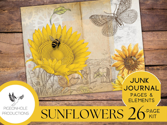 Vintage Sunflower Junk Journal Kit, PRINTABLE, 26 sheets of journal pages, background papers and ephemera elements