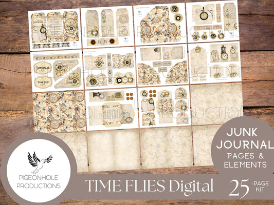 Time Flies Vintage Timepieces Junk Journal Kit—PRINTABLE—with uplifting quotes—25 pages, backgrounds, elements—70+ tags, pockets, more