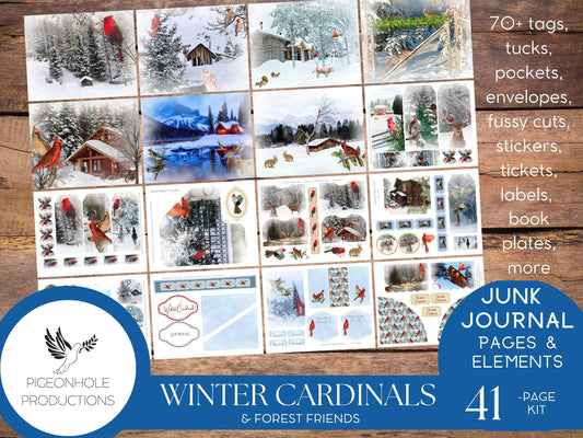 Winter Cardinal Bird & Forest Friends Winter Wonderland Junk Journal Kit—PRINTABLE—includes pages and all ephemera needed—see description!