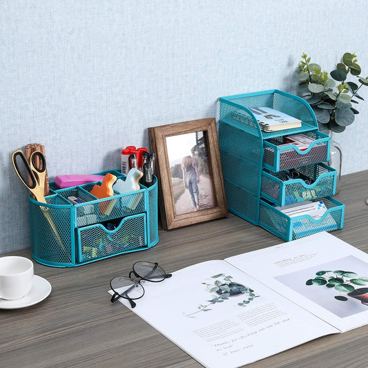 PAG Desk Organizers and Accessories Storage Caddy, Office Supplies Desktop Organization, Office Decor Mesh Pencil Holder, 9 Compartments, Blue