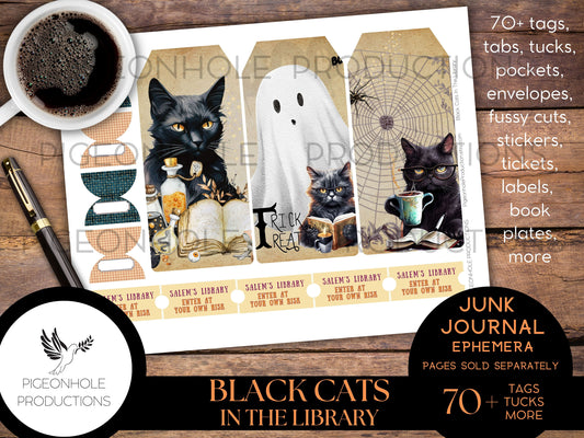 Black Cats In the Library Junk Journal EPHEMERA, PRINTABLE, 70+ tags, pockets, envelopes, fussy cuts, stickers, tickets, labels, bookplates
