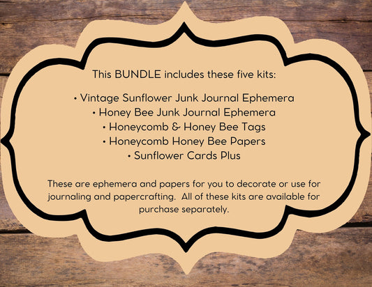 Honey Bee Sunflower Junk Journal Ephemera BUNDLE, includes 5 kits of tags, tucks, pockets, labels, fussy cuts, envelopes, papers, more!