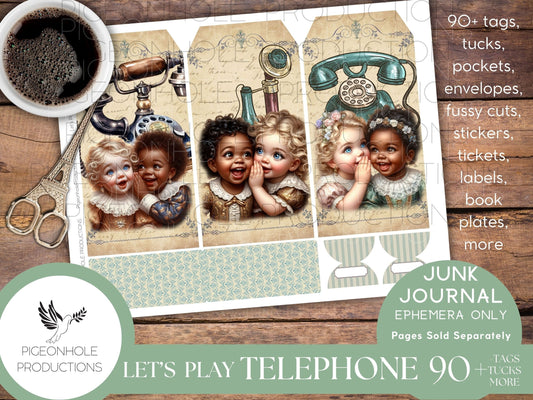 Let's Play Telephone Junk Journal EPHEMERA, PRINTABLE, 90+ tags, tucks, pockets, envelopes, fussy cuts, tickets, labels, bookplates, SWEET!