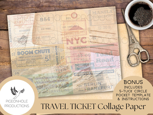 Travel & Event Ticket Collage Papers—PRINTABLE—with coordinating backings and BONUS 5-Tuck Circle Pocket Template and Instructions—see pics!