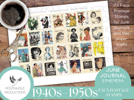 1940s-1950s Faux Postage Stamps—PRINTABLE—Use in junk journals, planners, scrapbooking, collage, or print on sticker paper for stickers