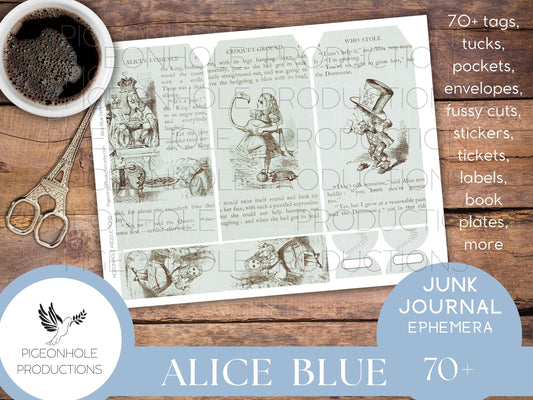 Alice In Wonderland BLUE Junk Journal EPHEMERA, PRINTABLE, 70+ tags, tucks, pockets, envelopes, stickers, tickets, labels, bookplates, more!