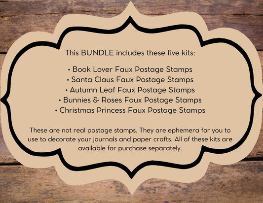 Faux Postage Stamps Ephemera BUNDLE, includes 5 kits include Autumn Fall, Christmas, Book Lover, Bunnies & Roses stamps for journals, crafts