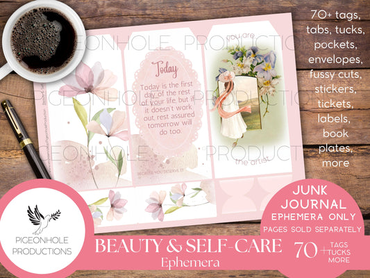 Beauty & Self-Care Junk Journal EPHEMERA, PRINTABLE, 70+ tags, tucks, pockets, envelopes, fussy cuts, stickers, tickets, labels, bookplates