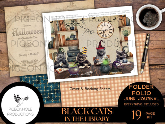 FOLDER FOLIO Black Cats In the Library Halloween Junk Journal, PRINTABLE, cover, backings, pockets, tags, envelope, fussy cuts, stickers