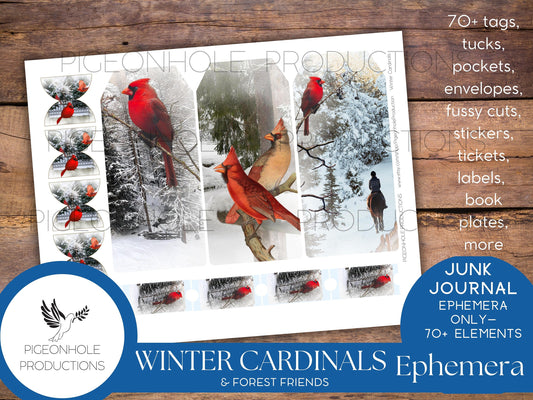 Winter Cardinal Bird Junk Journal EPHEMERA—PRINTABLE—70+ tags, tucks, pockets, envelopes, fussy cuts, stickers, tickets, labels, book plates