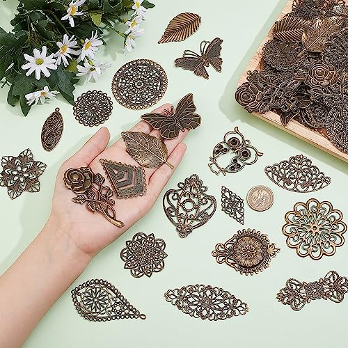 PH PandaHall 120pcs Filigree Metal Embellishments 19 Style Filigree Connectors Charms Antique Bronze Flower Animal Pendants for Steampunk Mixed Media Art Hairpin Headwear Necklace Jewelry Making