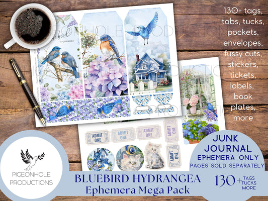 Bluebird Hydrangea Junk Journal EPHEMERA, PRINTABLE, 130+ tags, tucks, pockets, envelopes, fussy cuts, stickers, tickets, labels, bookplates