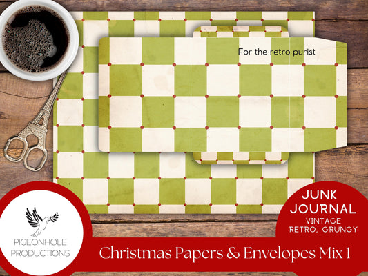 Retro Christmas Junk Journal Paper & Envelopes MIX 1—PRINTABLE—6 sheets with coordinating envelopes—for journal making and paper crafting