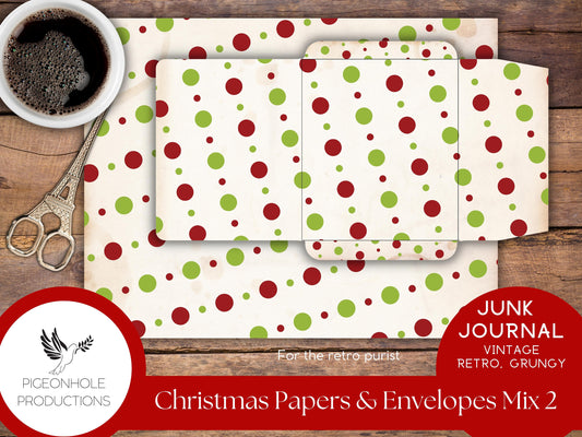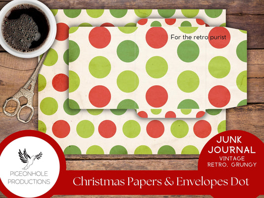 Retro Christmas Junk Journal Paper & Envelopes DOTS—PRINTABLE—8 sheets with coordinating envelopes—for journal making and paper crafting