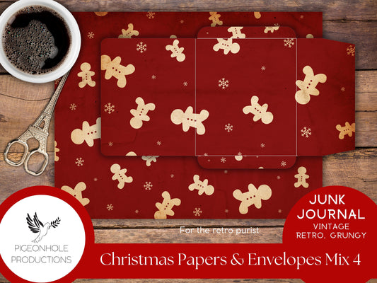 Retro Christmas Junk Journal Paper & Envelopes MIX 4—PRINTABLE—6 sheets with coordinating envelopes—for journal making and paper crafting
