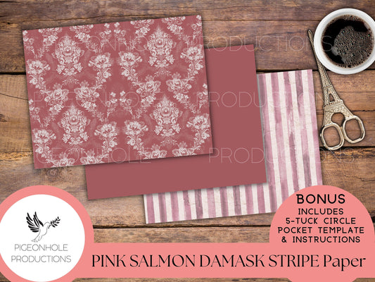 Pink Salmon Damask Stripe Papers—PRINTABLE—with coordinating backings and BONUS 5-Tuck Circle Pocket Template and Instructions—see pics!