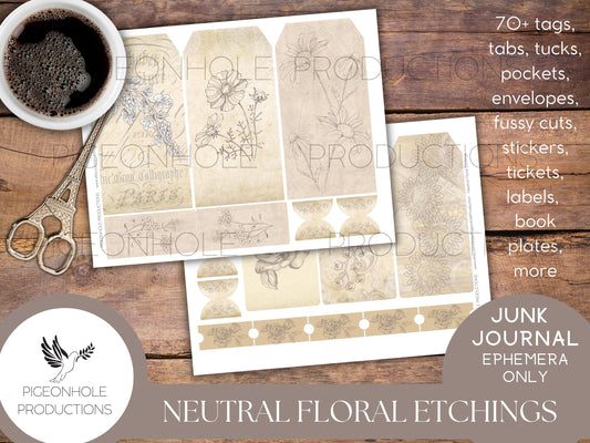 Neutral Floral Etchings Junk Journal EPHEMERA—PRINTABLE—70+ tags, tucks, pockets, envelopes, page tabs, tickets, labels, book plates, more