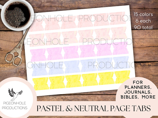 Pastel & Neutral Page Tabs—PRINTABLE—for planners, journals, Bibles, more—15 colors, 6 each, 90 total—pretty for spring, summer, Easter