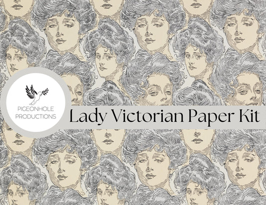 Lady Victorian Paper Kit—PRINTABLE—7 sheets—for junk journals, scrapbooking, papercrafts, cardmaking, tags, pockets, more!