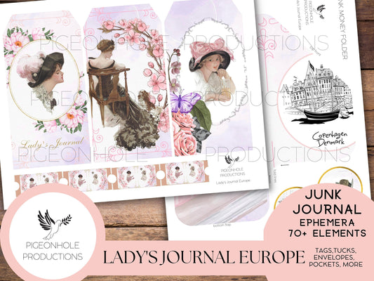 Lady's Journal Europe Junk Journal EPHEMERA—PRINTABLE—70+ journal cards, tags, tucks, pockets, envelopes, tickets, more