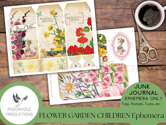 Flower Garden Children Junk Journal EPHEMERA—PRINTABLE—70+ tags, tucks, pockets, envelopes, fussy cuts/stickers, tickets, labels, bookplates