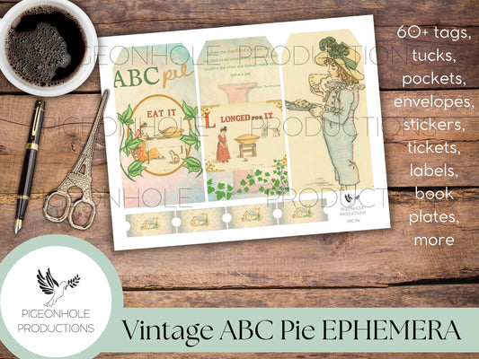 ABC Pie Junk Journal EPHEMERA, PRINTABLE, 60+ tags, tucks, pockets, envelopes, stickers, tickets, labels, book plates, more, sweet childhood