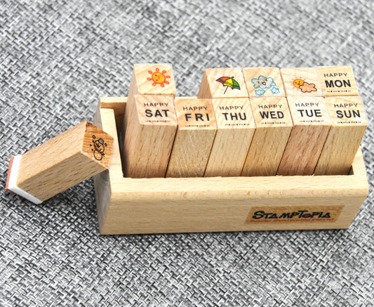 Youkwer 12 Pcs Mini Cute Wooden Rubber Stamps DIY Diary Scrapbook Stamps Set with Wooden Box (Week,Weather)