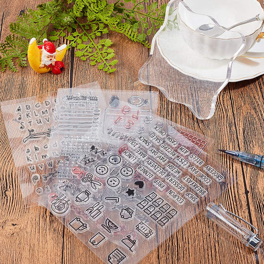 PH PandaHall Clear Journal Stamps, 4 Sheets Clear Silicone Stamps Alphabet Symbol Stamp Seal Calendar Planner Stamps with Square Acrylic Block Pad for Week Dates Month Organizer Scrapbooking Photo