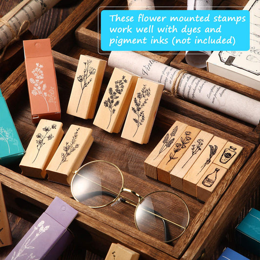 16 Pieces Vintage Wood Rubber Stamps Flower and Plant Decorative Rubber Stamp Wooden Mounted Stamp Set for DIY Crafting, Scrapbook, Painting, Letters Diary, Teaching and Card Making
