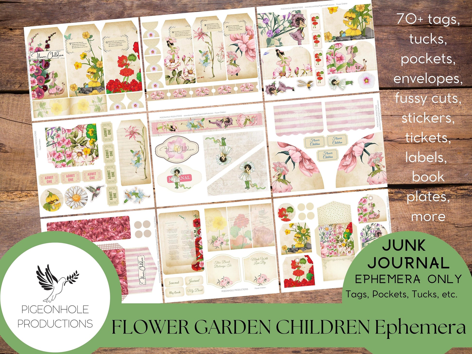 Flower Garden Children Junk Journal EPHEMERA—PRINTABLE—70+ tags, tucks, pockets, envelopes, fussy cuts/stickers, tickets, labels, bookplates